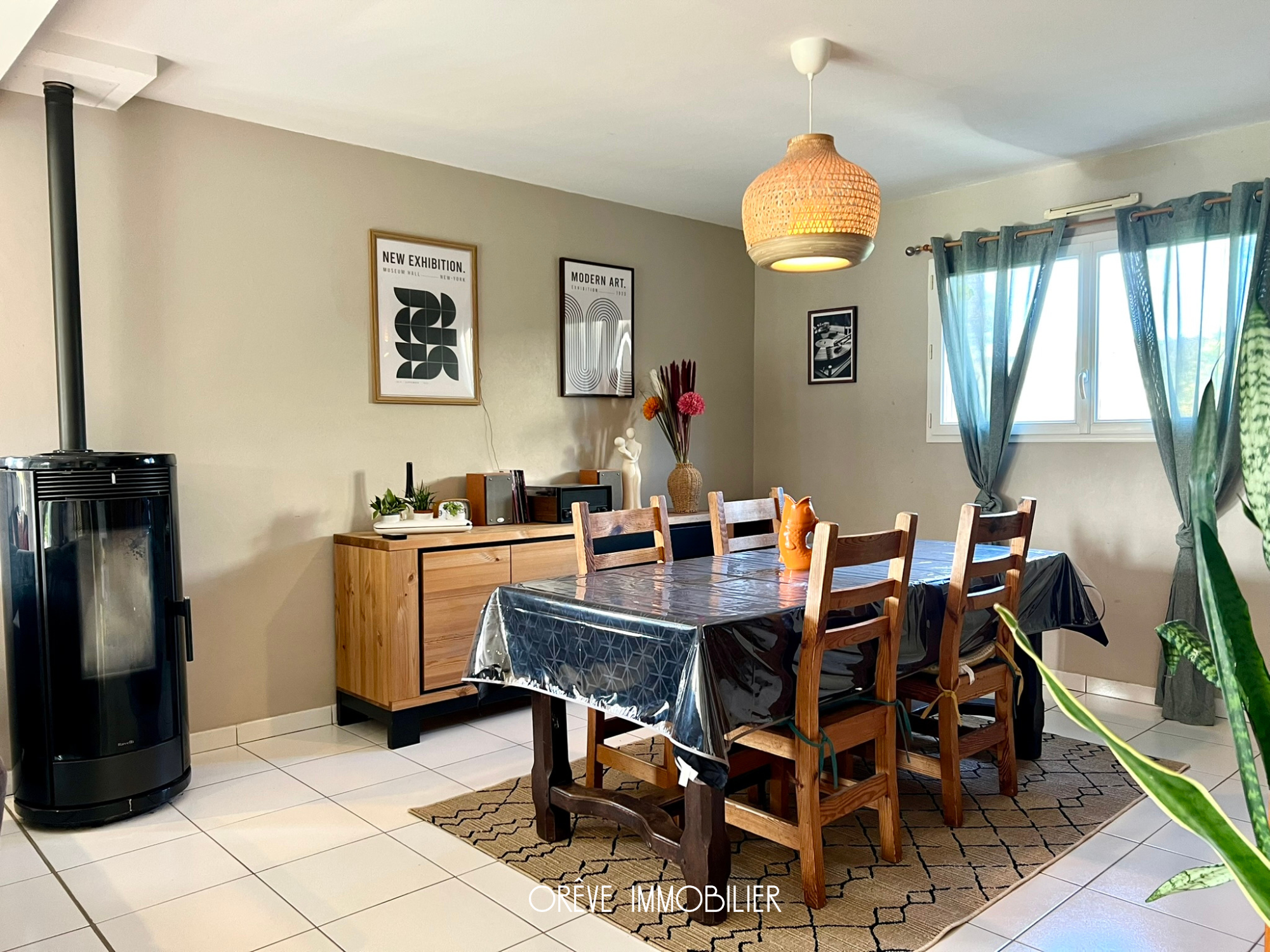La pièce de vie, exposée sud-ouest, bénéficie d’une belle luminosité et d’une atmosphère chaleureuse grâce à son poêle à granulés.